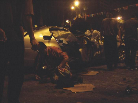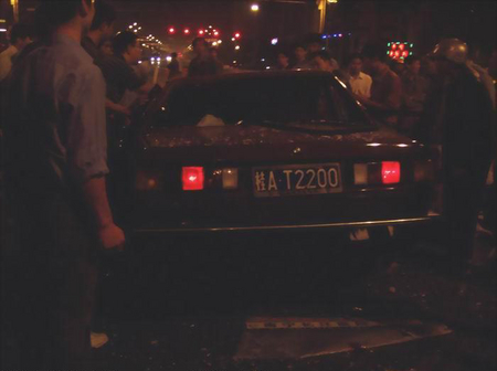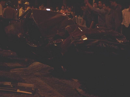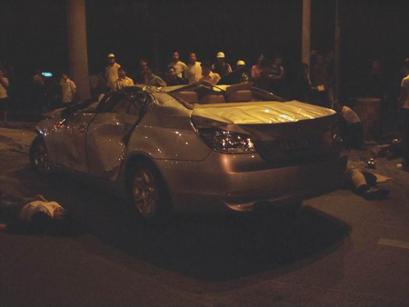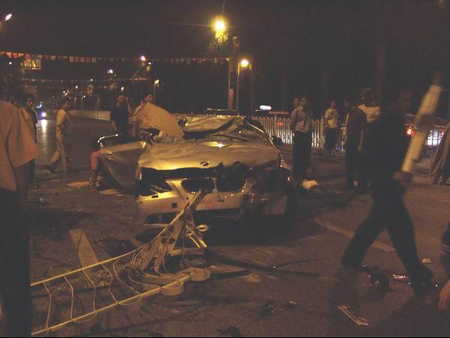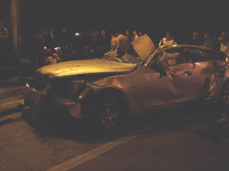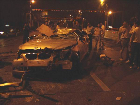 10月28日凌晨2:20分左右,在廣西南寧市民族大道圓湖路口往民族宮方向50米左右,一輛嶄新的寶馬5系轎車高速通過路口以后失控撞到路中間的鐵質護攔,撞開一個十多米的大口后沖到對面車道上,與一輛紅色桑塔納出租車猛烈相撞,并且飛起來整車倒扣過來重重壓在出租車上后再翻個跟斗后落在地上,把出租車壓得扁完,連底盤都壓到地上了,四個車輪都歪過一邊,出租車司機被緊緊的壓在車里面,還伸出一只手求教,看上去真的很凄涼,隨后司機被趕到的消防官兵全力救了出來送上救護車,應該還能搶救過來的;而寶馬車上的幾個氣囊全部打開,車門雖然也變形嚴重,但也能正常打開,所以三個乘客都被路人救出來躺在路上,一個女士頭部受創,另一個女士手部骨頭折斷,而車上的男士也是渾身是血,靠在車邊動彈不得.據現場群眾反映,寶馬車應該是一女士開車,沖過路口的時候車速起碼有150時速以上,而且車里酒氣很重,懷疑是酒后駕駛,以寶馬車那么良好的駕駛性能,那么良好的安全措施,竟然被撞成那樣子,還能保全車上乘客的性命,也無可挑剔了.最無辜的肯定是出租車司機了,無端端遭遇那么大的橫禍,差點連命都丟了,真的很慘,所以奉歉那些不遵守交規的人,自己不想活可不要連累別人,血的教訓啊!!!