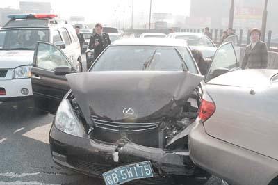 撞車事件發(fā)生在鶴州商場對面廣深高速往松崗方向車道左側的快車道,多部車輛車頭毀損嚴重,車中有雷克薩斯、皇冠等,其中還有一輛警用吉普也未能幸免。