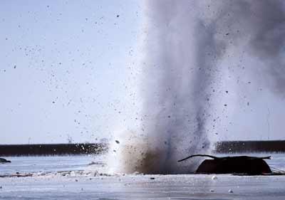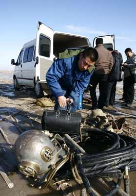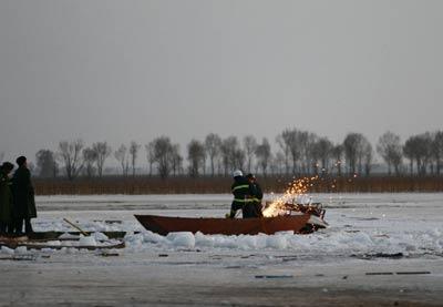 10時左右,一聲悶響,一股水柱夾著碎冰塊直沖起十幾米高,據警戒線內的維護現場秩序的民警講,這是經過討論通過的辦法,一些當地經常在冬天炸冰捕魚的農民參與了今天的破冰工作,因為他們更有炸冰的經驗。約1個半小時后,又是一聲悶響,只是沒有剛才那聲響,沖起的水柱也沒有剛才高。打撈工作在緊張進行,一位救援人員告訴記者,上午對冰面實施了兩次爆破,是為了擴大作業面,減輕冰面阻力。據潛水員勘察,客車失事處的冰有2層,冰下為活水,兩層冰的夾層中水深也超過半米,這證明失事處的水面不久前曾經大幅上漲,更加劇了行車危險。