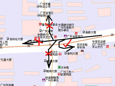 廣州的東風路和農林下路的交叉口,就是廣發銀行大廈門前的路口,因這幾天那路口突然不準再轉右去環市路,結果一群一群車輛被JCSS伏擊,偶實在看不下去了!