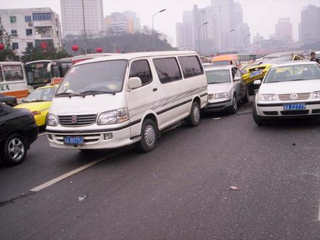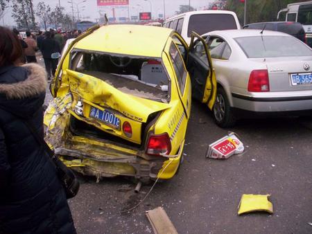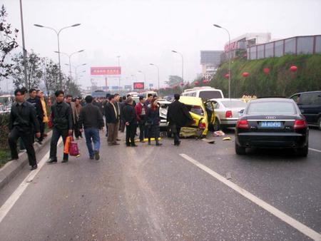 車禍涉及的16輛大小車輛撞成三“團”。最嚴重的一“團”由靠近南橋頭的7輛車組成,這些車或被擠扁,或撞上隔離帶,都發(fā)生了不同程度的變形,而肇事的貨車就在這一“團”之中。“受傷”最嚴重的是一輛羚羊出租車(車牌渝BT0637),車身已完全被撞扁,駕駛室內(nèi)還留有血跡。不遠處,一輛銀色長安小面包車也側(cè)翻在了隔壁帶上,在其后面,又是數(shù)輛車撞成一堆。