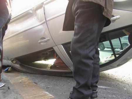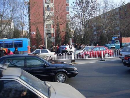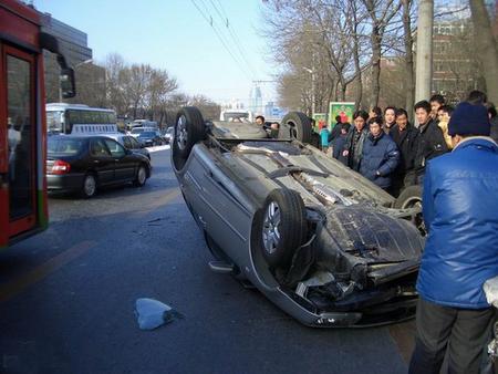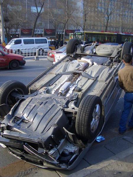 初四下午我去亞運村車市看看車,正轉悠,忽聽一聲巨響,只見一由北向南行駛的寶來撞到中間護欄后飛起翻落在由南向北的路邊……