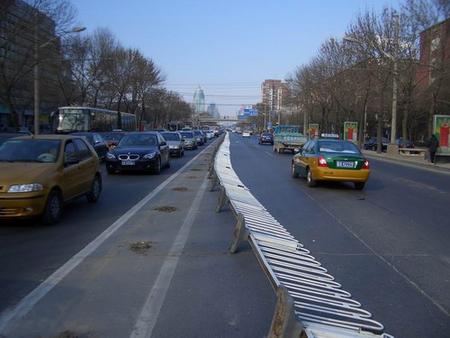 中央護欄全都連根被放倒,盛況空前。