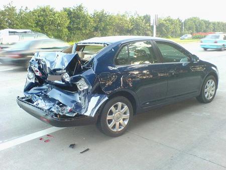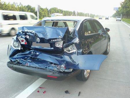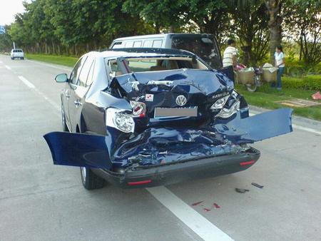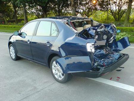 今天路過看見一臺嶄新、剛下地不到半小時的速騰為了閃避前車掉下來的床墊被后面的大貨車追尾撞成這樣,三廂變兩廂了,真可惜!!