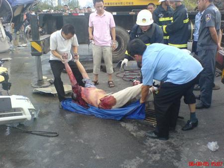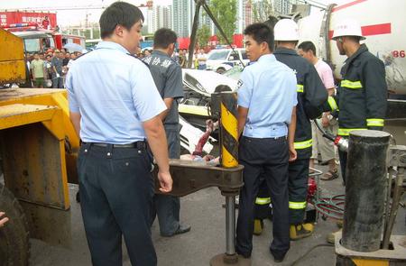 隨后,工作人員立即調整了受力點,并重新起吊。隨后,在剛趕到的另一輛吊車協助下,3:15,壓在轎車車身上的罐車終于被吊開。據在場一名消防隊員稱,由于溫度高,害怕起吊時因摩擦發生火花,在整個起吊過程中他們一直都用高壓水槍對車輛進行降溫。