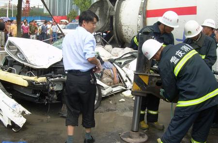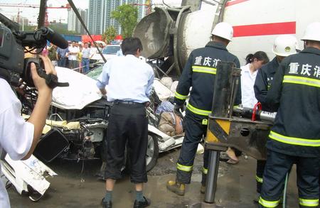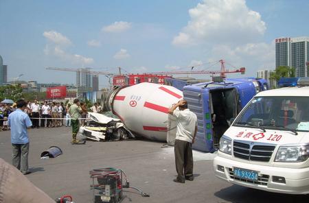 這是一輛即將發往外地的蒙迪歐新車,本是一個車隊,從照母山方向往華新分流道直行,也許為了保持隊型,所以該車加速在緊跟,結果從香樟林方向往上丁公園方向的水泥罐車司機也很可愛,你要跟上去,我偏要把你們截斷、隔開,因為速度太快,這個玩笑開大了,使相撞無法避免,水泥車猛往左打方向盤側翻,重壓在蒙迪歐車上。