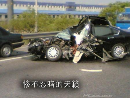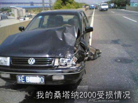 2005年9月16日(禮拜五)上午,中秋節的前兩天,我一人駕車從常熟經沿江高速趕往上海,后備箱里裝了幾箱月餅和水果。因業務關系,這段路我每月要走數次。全程路況很熟。從常熟通江路入口上沿江高速經滬嘉瀏高速至桃浦路出口,共80公里不到。 8點多鐘我駕著桑2000上了高速,當天天氣很好,可謂秋高氣爽,我這部桑車購于2000年,我的駕齡也是從購車那年開始。此時桑2000里程已達20萬公里。在此以前的一年里,該車是大病沒有,小病不斷,易損件幾乎換了一遍。車的門窗經過數次拆卸后,密封性大降,超過100公里/h后噪音特大,所以很少能超過100公里,上沿江高速后趕覺噪聲比平時大些,經觀察發現引擎蓋似乎沒蓋牢,估計是前天晚上洗車加風擋水時沒蓋牢所致。可又不敢停車,只好60碼左右捱到太倉沙溪服務區才把引擎蓋重新蓋好。出了服務區,一切正常,或許是中秋節快到的原因,一路車都很少,不久進入了上海段的滬嘉瀏高速。領卡后不久,為追回前段路浪費的時間,我的車速也比平時快了些許。此段路為雙車道即超車道、行車道和緊急停車帶。9點25分左右離南翔出口大約2公里,我正以時速110左右在行車道行駛,此時左前方超車道上一部黑色天籟速度慢了下來,因該部車子超我車時速度很快,幾分鐘前已把我甩得很遠。不知為何現在速度卻慢了下來,該車離我越來越近,感覺一會就可以超過它了。當我車和天籟相距約五六十米時,意外發生了,那一瞬間象無聲電影一樣烙在了我的腦海里:天籟忽然和前面一部似乎忽然出現的車子撞在一起,黑色的天籟一下變的又高又大,同時像堵墻似的橫在了我前面的行車道上,,霎時我意識到天籟出事了,我也很危險。相撞已不可避免。下意識的緊握方向盤右打,剎車也不知踩沒踩。隨著一陣劇烈顫動,我身體急向前沖,而安全帶又牢牢地把我向后拉,只感覺肩膀巨痛。奇跡發生了,我竟沖了過去。但護欄立即出現在眼前,我向左急回方向并沿著緊急停車帶向前滑行,等確認不會有后車追尾時,我才將車停在了路邊。感覺除了左肩膀安全帶處有些疼痛外其他一切正常,推推車門,打不開。引擎蓋也上蹺起來。我伸手試試右車門。還正常。正正心神后從副駕門出來,一邊用手機撥打110報警,此時為9點25分,先大致察看以下自己車子情況。