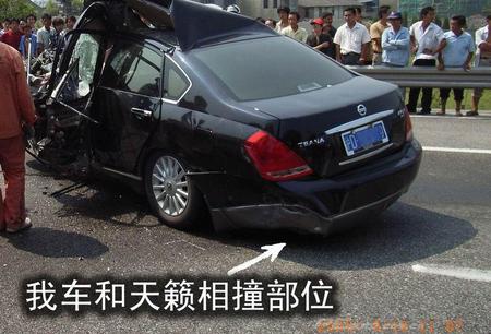此時還有護欄和卡車間的一人沒有救出,只有等吊車了,因為卡車左前輪已緊緊卡在路牙與護欄間,只有向上吊起。10點半左右,從南翔方向開來一部吊車,10點45分卡車被吊起,但女養(yǎng)護工早已氣絕身亡。11點40左右我的車子被拖走。下午去交警隊作了筆錄。筆錄后我又去看了出事的天籟,發(fā)現(xiàn)我竟然是和天籟的左后部保險杠逆向相撞,(我原來以為撞到天籟的右前角),天籟后保險杠左下部位凹進去一塊。相比之下桑車左前部的損傷要大得多了。推側(cè)事故經(jīng)過如下:天籟追撞卡車的右后部后,卡車前沖入前方的養(yǎng)護工人群。因左前輪卡入路沿與護欄才停下。而近5米長的天籟在巨大的慣性作用下逆時針旋轉(zhuǎn)著沖入行車道。同時引擎蓋飛起,接著駕駛室上翻,給我留下該車瞬時又高又大的怪異現(xiàn)象,在和我相撞的瞬間,旋轉(zhuǎn)中的天籟是尾前頭后。相撞后天籟繼續(xù)旋轉(zhuǎn)180度才停下來,看后只覺得毛骨悚然,感覺如同從旋轉(zhuǎn)的螺旋槳縫隙中穿過?梢哉f我是在最恰當?shù)慕嵌群蜁r機與其相撞,否則后果不堪設想。