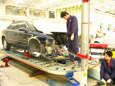 這是車架矯正儀,價值十多萬人民幣!這量車也真是可憐了,給撞壞了大梁