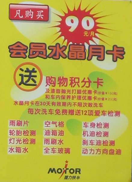 捷力快車廣州番禺店目前提供90元/月的會員水晶月卡辦理活動,憑此會員卡可以享受不限次的洗車服務和12項的免費愛車檢測項目。車主馬上申請辦理月卡,還有價值360元的超值保養優惠卡贈送。