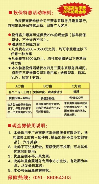 為了更好地回饋廣大客戶,南菱汽車集團特在三菱車系服務月期間(4月1日至4月30日)推出了投保優惠服務活動;顒悠陂g,客戶可以享受以下優惠項目。
