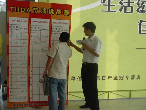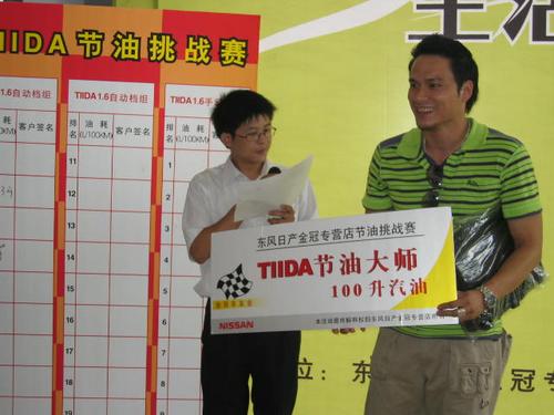 經過精心策劃和充分準備,由東風日產金冠專營店主辦、并由近30位東風日產TIIDA車主鼎力參加的"TIIDA嘉年華-TIIDA節油大賽"活動圓滿成功!活動全程近110公里,途經番禺廣場、南沙客運站,最后回到金冠專營店。比賽結束后金冠專營店評選出TIIDA自動檔冠、亞軍各一名,TIIDA手動檔冠軍一名。其中麥先生以4.16L/KM的成績獲得自動檔冠軍,得到120L汽油的獎勵,事后他非常開心,說沒想到自己會拿獎,說東風日產頤達(騏達)車不但空間大,乘坐舒適,還非常省油,能買到這樣一部好車,真是很幸運。而另一位馮先生則以3.70L/KM的成績獲得手動檔冠軍。