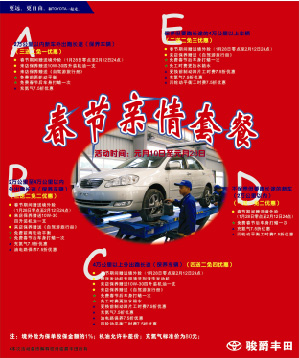 新年新氣象,深圳駿爵汽車集團下屬的香密湖駿爵豐田4S店近來屢獲嘉獎,不僅獲得” “廣東省一類汽車維修企業(yè)”的殊榮,更憑借不凡的實力獲得了“政府公務車維修”的資格.為回饋廣大車主對我店的支持,值此辭舊迎新之際,現(xiàn)推出“春節(jié)親情服活動”,向所有來店車主提供系列化套餐服務。