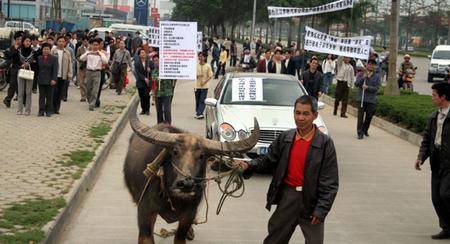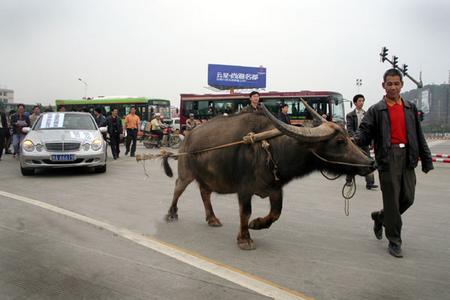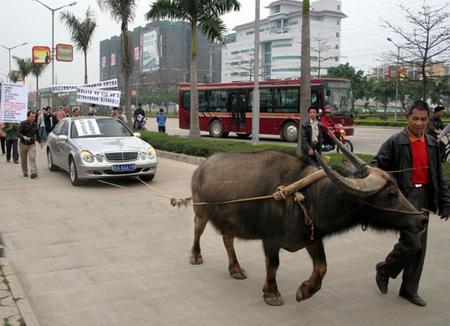 在多次與奔馳服務中心交涉沒得到滿意答復后,楊先生為表達他對所購奔馳車質量的不滿,出此“奇招”:讓一老農用水牛拉著他的奔馳車在白沙大道上游街。聞訊趕來的交警最終制止了這種行為。