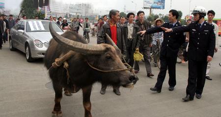 昨日上午10時30分左右,南寧市白沙大道上突然熱鬧起來——一輛漂亮的奔馳E240轎車竟由一頭水牛拉著游街。一老農用水牛拉著他的奔馳E240轎車在白沙大道個星光大道上行走了20多分鐘,直到多名警察趕來制止才結束。