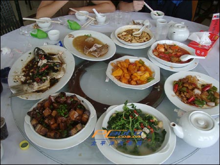 星期六中午12點到達九龍湖渡假村,入住花園別墅,十二點是在當地的“椰林餐廳”進行豐富的農家宴。我們那桌的胃口都還算不錯,把整桌的東西一掃而光。