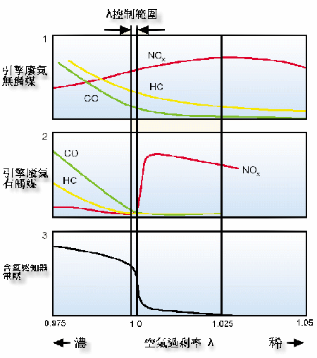 然而觸媒轉化器的使用條件相當嚴苛,除了須達到較高工作溫度外,最重要的是它的最大凈化率是發生在理論混合比附近(14.7:1)如上圖,也就是說引擎的燃燒須控制在14.7:1 空燃混合之下,要達到此細微之標準并不容易,所以才藉由氧傳感器的作用將空燃比轉換成數據供給引擎計算機進而調整到理論范圍,稍后也將述說到引擎計算機如何利用含氧感知的訊號來作回饋的作用,使其空燃比維持在14.7:1附近。
