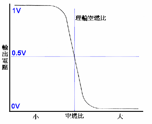 內層白金面所大氣接觸,所以氧氣濃度高,外層白金與排氣接觸,氧氣濃度低。當混合比較高時,排放的廢氣所含的氧相對地減少,因此氧化鋯兩側的白金所接觸到的氧氣高低落差大,所產生的電動勢也相對高(將近1V);當混合比稀時,燃燒完所多余的氧氣較多,氧化鋯兩側的白金層的氧氣落差小,因此所產生的電動勢低(將近0V)。由上述的情形可得到下圖表
