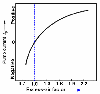 它的構(gòu)造大致上包括含氧感應(yīng)室(Nernst cell),這部份就是和LAF的Sensor1一樣的作用,及含氧加壓室(Pump cell)和一個加熱組件(Heater)。引擎的廢氣會經(jīng)由擴散孔(Diffusiton gap),來到感應(yīng)室與加壓室之間。引擎電壓會送一訊號來到加壓室以作為廢氣中含氧的參考值,藉由改變電流大小及方向來改變感應(yīng)室的輸出,并且由這個加壓電流 Ip (Pump current)可得到與空氣過剩率(λ值)的相對圖表