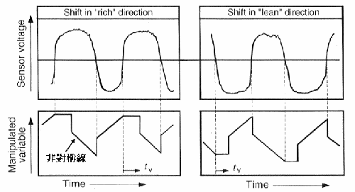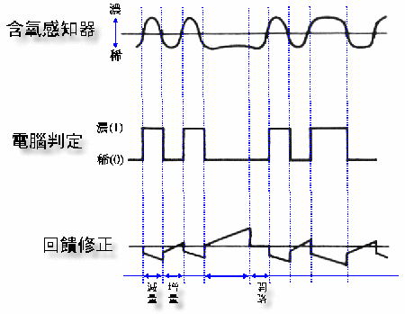 一般氧化鋯型氧傳感器有個特性,就是當λ=1時電壓反應較為急遽,利用這個特性可作為濃與稀的分界而形成兩段式控制(Two-step Control),當引擎計算機接收到此電壓時是屬于模擬訊號,經模擬數字轉換大致可得到紅色虛線的數字訊號,計算機即可判斷出混合比的濃與稀,分別以1與0來表示,當數字訊號為1時作出減量控制,也就是減少噴油量;當訊號為0時作出增量控制,如下圖