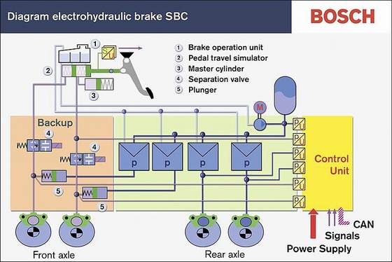 SBC就是使用電子脈沖,將駕駛員的制動命令傳遞到一個微處理器中,由它同步處理各種不同傳感器信號,并根據特定行駛狀態計算每一個車輪的最優制動力。這樣,當在拐彎或者濕滑路面上制動時,SBC能提供比傳統制動系統更好的主動安全性。SBC系統的高壓儲能及電控閥裝置能保證最大制動壓力更快產生作用。另外,該系統提供的附加功能能減少駕駛員駕車中的操作強度。如交通擁擠輔助功能:在走走停停的交通狀態下,汽車可以在駕駛員松開加速踏板時自動制動。它的柔和停車功能則可以讓汽車在城市交通中特別柔和而平順地停下來。