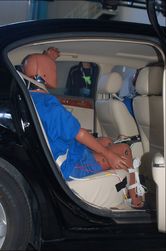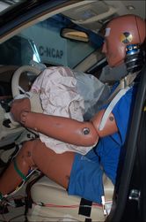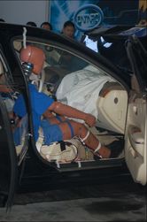 接下來看看車內,三個假人在試驗中的姿態被約束系統有效的控制住,前排左右兩個假人臉部的涂料分別在氣囊偏向中心的位置留下了相對清晰的印記,表明二者在接觸時位置很正,沒有發生偏斜的情況。再看看下部,假人的腿部在與儀表臺的接觸中分別留有綠色和紅色的涂料。另外,君越的前擋風玻璃沒有發生破碎,完好無損。從以外的經驗可以分析出,在50Km/h的時速下正面碰撞,前風擋破碎的可能只要有兩種:一是發動機蓋向后插入所至,如之前的雨燕;二是儀表臺在慣性作用下向前沖擊造成。君越的風擋完好,自然說明兩種情況均未發生。 知識鏈接: 雙級安全氣囊 雙級安全氣囊是比較新的一項氣囊技術,車輛一旦發生事故,雙級安全氣囊能夠根據事故的嚴重程度分兩級觸發打開氣囊。也就是說在碰撞程度較輕時,只觸發一級安全氣囊,當比較嚴重時全部出發。這樣可以減少對車內乘員的傷害,畢竟氣囊是以火藥激發,它的爆炸還是會造成一定的傷害。 版權聲明:本文版權歸太平洋汽車網所有。未經授權不得擅自轉載!轉載請注明出處,否則一經發現,必將追究。 |