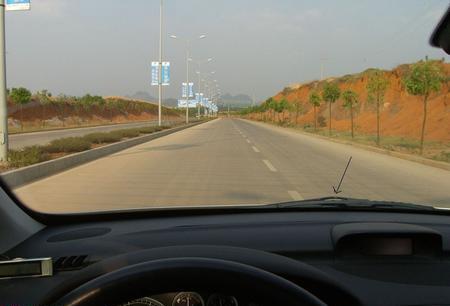 在駕駛時,我們的兩眼視線成扇形。將右前輪向前方延伸,與我們的右側視線在道路上相交,交點有無數個。在車上找一個點,比如檔風玻璃、中控臺、雨刮器等,作為我們確定右前輪位置的參照點。 我是以雨刮器凸起部分作為參照點。視線通過此參照點向下看到路面,相交點就是右前輪位置。(圖B)