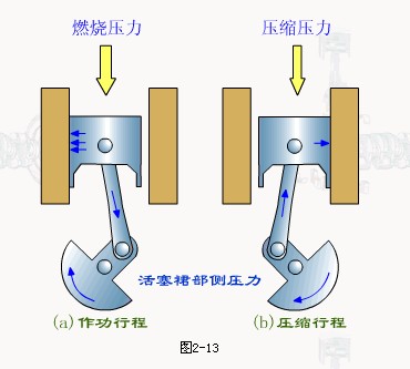 行程和作功行程中,作用在活塞頂部的氣體壓力的水平分力使活塞壓向氣缸壁。壓縮行程和作功行程氣體的側壓力方向正好相反,由于燃燒壓力大大高于壓縮壓力,所以,作功行程中的側壓力也大大高于壓縮行程中的側壓力(圖2-13)。活塞裙部承受側壓力的兩個側面稱為推力面,它們處于與活塞銷軸線相垂直的方向上。