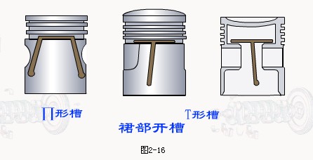 (4)有些活塞為了減輕重量,在裙部開孔或把裙部不受側壓力的兩邊切去一部分,以減小慣性力,減小銷座附近的熱變形量,形成拖板式活塞或短活塞(圖2-17),拖板式結構裙部彈性好,質量小,活塞與氣缸的配合間隙較小,適用于高速發動機。