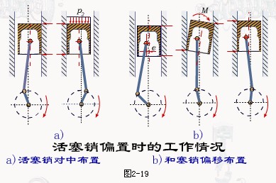 (6)有的汽油機上,活塞銷孔中心線是偏離活塞中心線平面的,向作功行程中受主側壓力的一方偏移了1~2mm(圖2-19)。這種結構可使活塞在從壓縮行程到作功行程中較為柔和地從壓向氣缸的一面過渡到壓向氣缸的另一面,以減小敲缸的聲音。在安裝時,這種活塞銷偏置的方向不能裝反,否則換向敲擊力會增大,使裙部受損