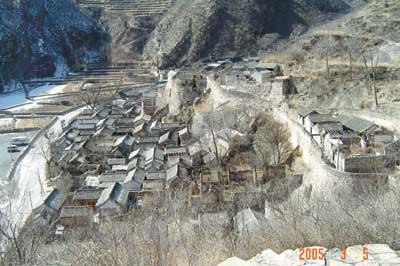 爨底下是距北京市區90公里昔日黃草梁古道(“京西古道”的一段)上商旅休息的驛道。坐著汽車俱樂部張哥開得像保險箱一樣平穩的身標7號的銀色夏利,我們出了西四環直奔古村。門頭溝景色挺新鮮,雖然沒有懷柔、順義郊區林立的商品樓看著繁華干凈,不過,可以看一眼北京燕山石化巨大的工業園區,水面寬廣還結著冰的齋堂水庫,初春暖陽下的百花山、靈山。一路走沿109國道到齋堂水庫右轉前行5公里,在轉過因為背陰至今還積雪的最后一道盤山道后,爨底下就在眼前了,整個行程約兩個半小時。