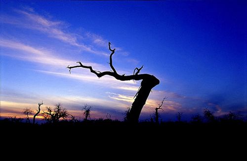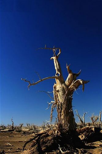我實在無法忘記,那片望不到邊際的怪樹林,那是一部讓生者震撼的教科書!我想叫它生命失樂園。所有生命都退卻了,天地間,只有胡楊,沙漠中的偉丈夫,還在飛沙走石中立著!只是,成片成片的胡楊,生命被剝奪了,被風被沙帶走了,被水帶走了,那些令人陶醉的金色葉子遠去了很久很久。于是他們高高地舉起自己與沙魔搏斗得千瘡百孔、軀體經絡畢現,身無半文水分的干枯身軀,浩然矗立在這風沙肆虐的大漠里,猶如歷劫不滅的雕塑。一站就是好幾百年,孤傲不羈,也不肯倒下。人們說,胡楊,活著,三百年不死,死了,三百年不倒,倒了,三百年不朽!而今,卻到下了,就倒在它祖祖輩輩的生息之地---額經濟納河流域,內蒙的金色之鄉,那個曾經弱水三千的地方。而現在,額濟納長期處于干旱之中。