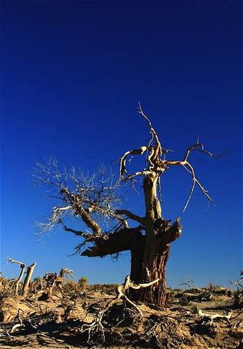很久以前,一個叫黑水的古城,也從額濟納走了。因為水走了。今天,成片成片的胡楊就這么倒下,吶喊著,悲壯地走了。那么明天,要走的恐怕就是人了,如果斷水再繼續。也許不用20年的光景,額濟納就是21世紀又一座黑水城。救-救胡楊吧!
