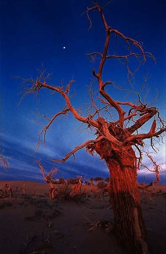 沙漠也有溫情默默的時候,斜陽下,我也曾聽見過胡楊動人的歌唱,那真是世界上絕妙的瀚海風騷大景致中的天籟。正如太白之慨嘆:天地常在壯觀中。如果沒有走進那片怪樹林,我真的以為胡楊一直活得很好,就象通常看到的唯美到極至的攝影作品那樣,在靜謐的大漠上燃燒著金色的生命火把。可是,就在地底下的水分,一天比一天流失得嚴重的時候;可是,就在胡楊孤兀地站在天地間,獨自承受風沙雨雪閃電雷鳴的時候;可是,就在那些過于嚴重的放牧啃噬胡楊的時候;胡楊終于無聲無息,無奈無助地黯然倒下,倒在我們的視野之外,于是,風沙對人類又多了一份又一分兇猛的肆虐。