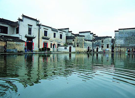 宏村位于黟城東北10公里處,青山綠水,湖光云影構成宏村獨特的神韻。宏村背倚黃山余脈羊棧嶺、雷崗山等,地勢較高,常常云蒸霞蔚,時而如潑墨重彩,時而如淡抹寫意,恰似山水長卷,溶自然景觀和人文景觀為一體,被譽為“中國畫里的鄉村”。特別是整個村子呈“牛”型結構布局,更是被譽為當今世界歷史文化遺產的一大奇跡。那巍峨蒼翠的雷崗當為牛首,參天古木是牛角,由東而西錯落有致的民居群宛如寵大的牛軀。以村西北一溪鑿圳繞屋過戶,九曲十彎的水渠,聚村中天然泉水匯合蓄成一口斗月形的池塘,形如牛腸和牛胃。水渠最后注入村南的湖泊,鵒稱牛肚。接著,人們又在繞村溪河上先后架起了四座橋梁,作為牛腿。歷經數年,一幅牛的圖騰躍然而出。這種別出心裁的科學的村落水系設計,不僅為村民解決了消防用水,而且調節了氣溫,為居民生產、生活用水提供了方便,創造了一種“浣汲未防溪路遠,家家門前有清泉”的良好環境。