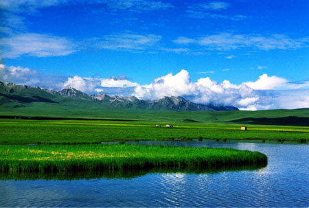 夏季是草原的黃金季節,這里天高氣爽,能見度很高。天地之間,綠草茵茵,繁花似錦,芳香幽幽,一望無涯。草地中星落棋布地點綴著無數小湖泊,湖水碧藍,小河如藤蔓把大大小小的湖泊串連起來,河水清澈見底,游魚可數。