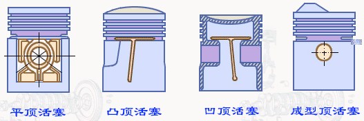 活塞頂部承受氣體壓力,它是燃燒室的組成部分,其形狀、位置、大小都和燃燒室的具體形式有關,都是為滿足可燃混合氣形成和燃燒的要求,其頂部形狀可分為四大類,平頂活塞、凸頂活塞、凹頂活塞和成型頂活塞。